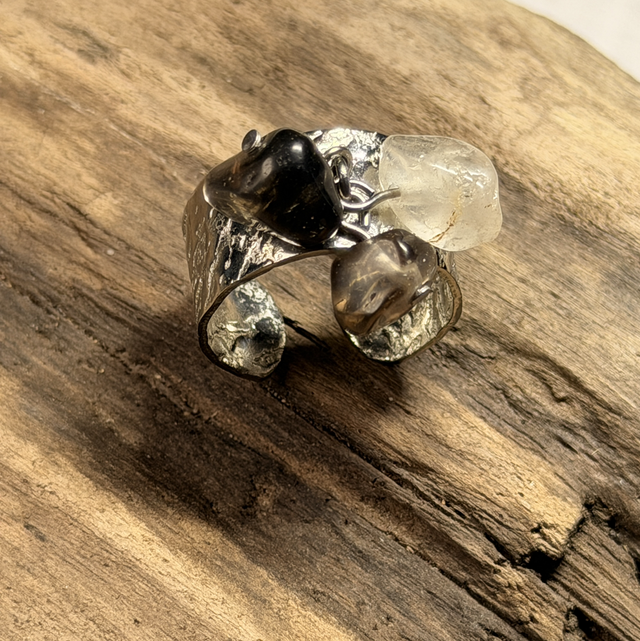 Bague réglable en acier inoxydable et quartz fumé.