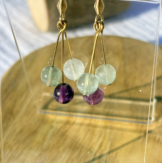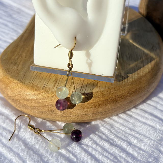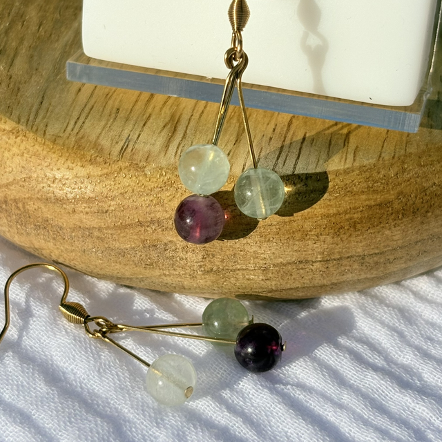 Magnifiques boucles d’oreilles en fluorite et acier inoxydable doré.